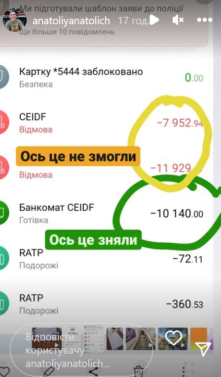 "Я спустився в метро, щоб купити квиток. У метро не можна сплатити за допомогою Google Pay або Apple Pay, як у нас. У Парижі все дуже допотопно. Потрібно вставити картку, ввести пін-код. Людей було дуже багато, популярна станція метро. Я вставив картку, ввів пін-код, і вже хвилин через 7 на телефон надійшло повідомлення, що зняли з моєї картки 260 євро. Я швидко заблокував карту. Було ще кілька спроб, але не змогли вже зняти", - розповів шоумен. - Мабуть, коли я вставляв картку, хтось помітив цей пін-код, бо без нього гроші не знімеш. Запам'ятали, вкрали у мене гаманець і зняли ці кошти".