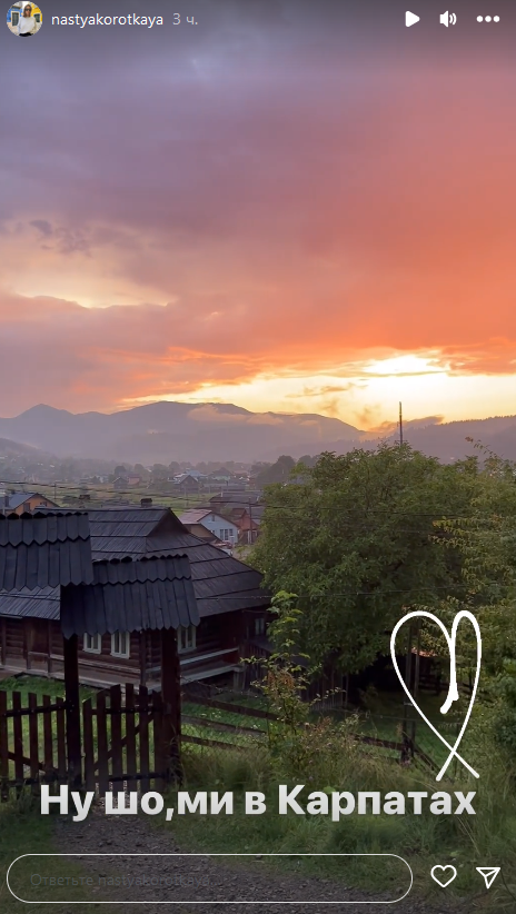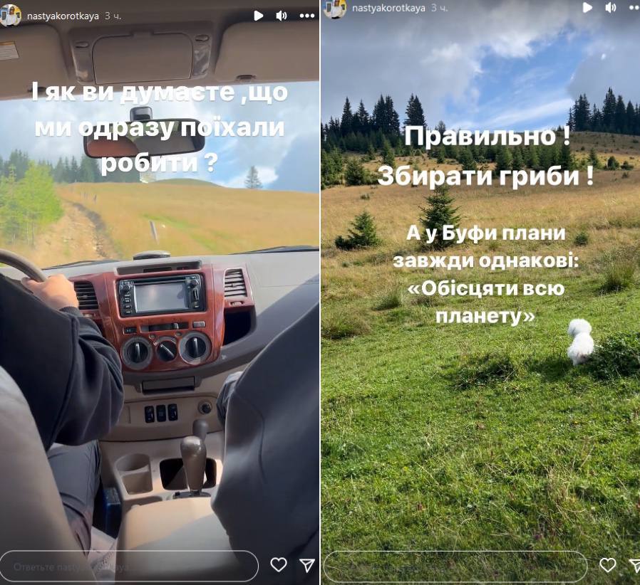 Акторка показала в "сторіз" захід сонця в Карпатах, дорогу в гори за грибами та улюбленицю Буфу, у якої "завжди плани однакові - обісцяти всю планету".