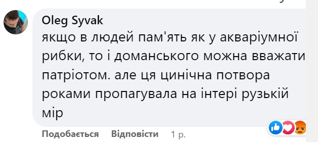 "Якщо в людей пам'ять як у акваріумної рибки, то і Доманського можна вважати патріотом. Але ця цинічна потвора роками пропагувала на інтері рузькій мір", - йшлося в одному із коментарів під роликом.
