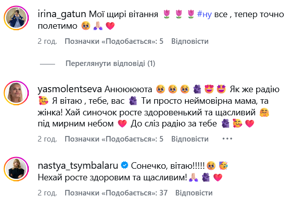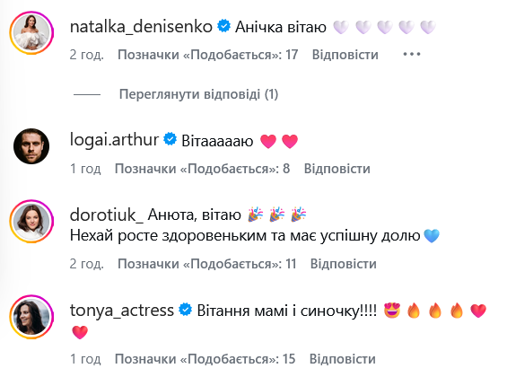 У коментарях акторку привітали шанувальники та колеги, зокрема Наталка Денисенко, Антоніна Хижняк, Ірина Гатун, Анастасія Цимбалару, Артур Логай.