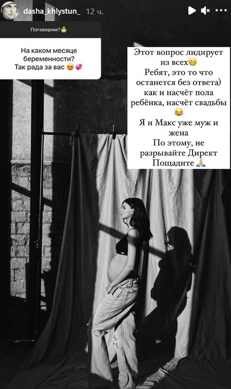 "Друзі, це те, що залишиться без відповіді, - пише Даша. - Як і щодо статі дитини, щодо весілля". Але потім дівчина написала, що вони з Максом вже чоловік і дружина, натякаючи тим самим, що вони узаконили свої стосунки.