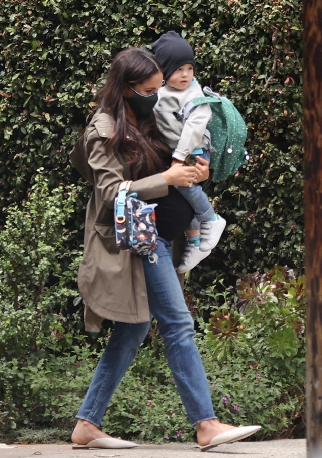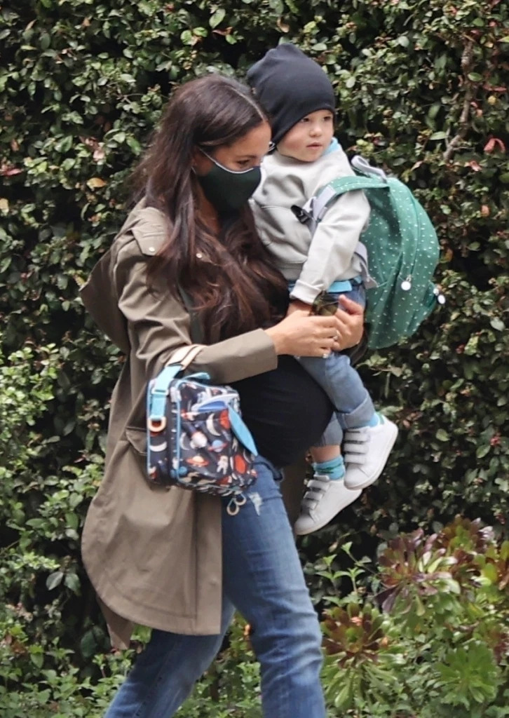 На знімках, опублікованих виданням Page Six, 39-річна герцогиня тримає на руках сина Арчі, якому в травні виповниться два роки. Дружина молодшого онука Єлизавети II була одягнена у сині джинси для майбутніх мам, які облягають в області живота, чорну футболку та вітровку кольору хаккі.