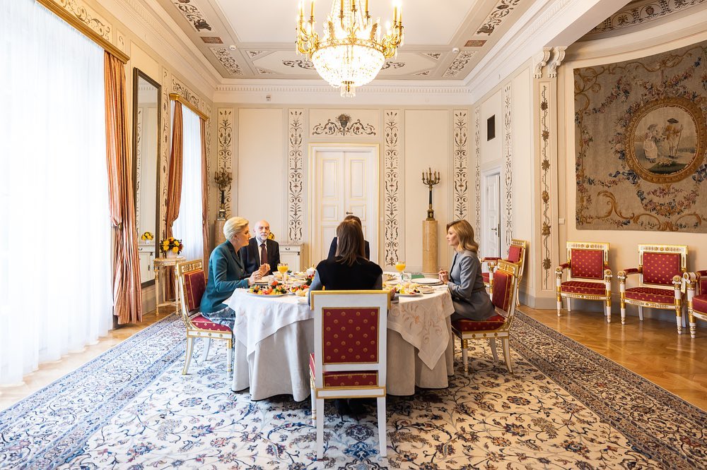 На зустрічі з Агатою Корнгаузер-Дудою перша леді з'явилася у вбранні сірого кольору. Вона обрала костюм із подовженим піджаком та прямими брюками. Лінію талії підкреслив лаконічний ремінець, а завершували образ туфлі на підборах, об'ємні сережки білосніжного відтінку та укладене як зазвичай волосся.