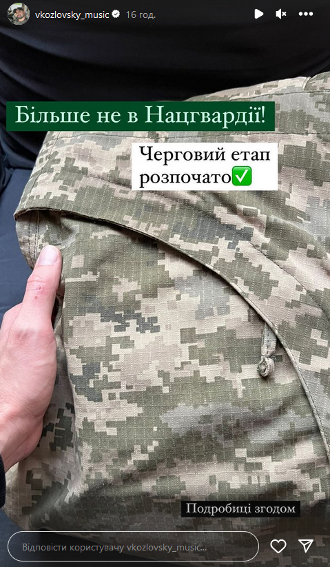 В Instagram-історіях виконавець показав фото своєї складеної військової форми і написав: "Більше не в Нацгвардії. Черговий етап розпочато. Подробиці згодом".