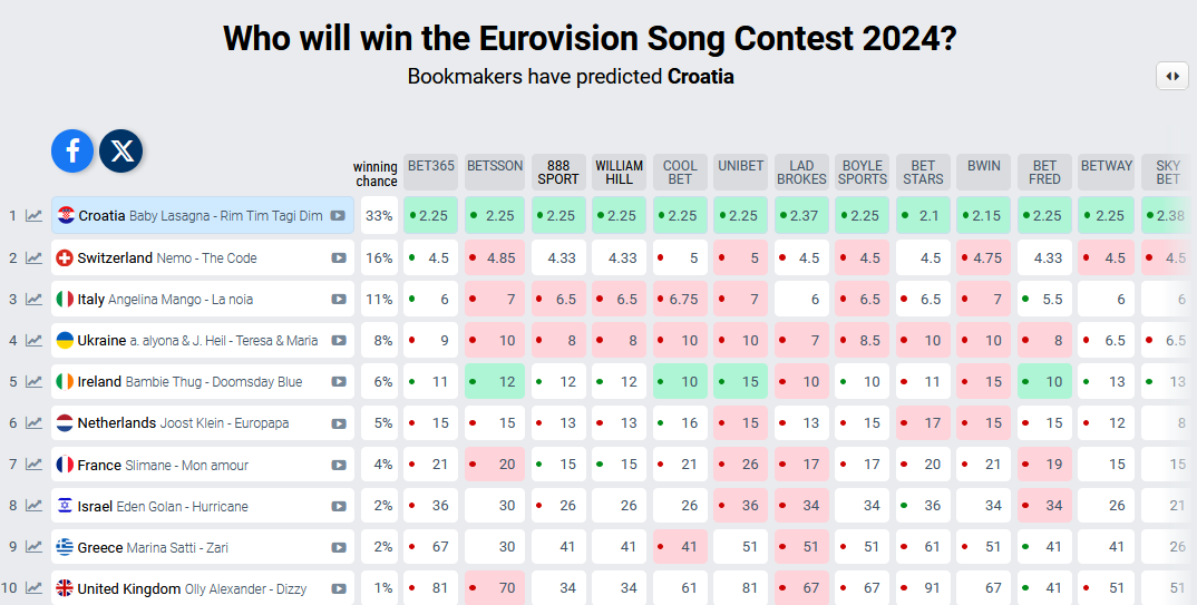 Фаворитом букмекерських ставок, станом на 7 травня, є співак Baby Lasagna (справжнє ім'я - Марко Пуришич) з Хорватії. Він змістив співака Nemo зі Швейцарії, який довго займав позицію лідера.
