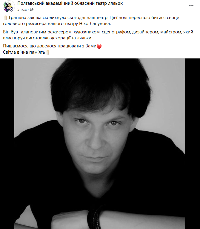 "Трагічна звістка сколихнула сьогодні наш театр. Цієї ночі перестало битися серце головного режисера нашого театру Ніко Лапунова. Він був талановитим режисером, художником, сценографом, дизайнером, майстром, який виготовляв декорації та ляльки. Пишаємося, що довелося працювати з Вами Світло вічна пам'ять", - написали колеги режисера.