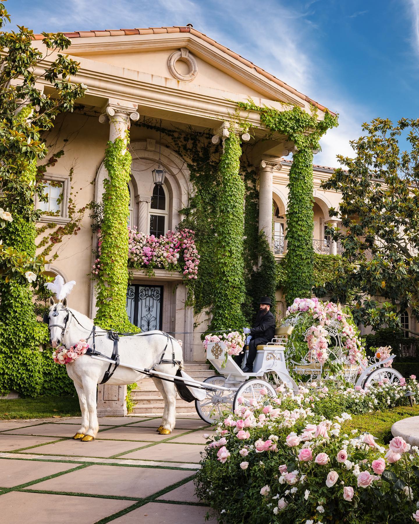 Будинок пари прикрасили трояндами, а у дворі стояв білий кінь із золотими копитами. Він віз карету, гідну принцеси поп-музики. Церемонія одруження проходила під наметом, задрапірованим квітами. Серед гостей були Мадонна, Селена Гомес, Дрю Беррімор, Періс Хілтон та Картер Реум, Донателла Версаче.