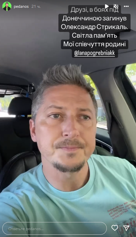 Трагічну новину в Instagram Stories повідомив ведучий проекту про стосунки Олександр Педан. "В боях під Донеччиною загинув учасник шоу "Екси" Саша Стрикаль. Він був дуже яскравим героєм нашої програми, а загинув як справжній герой України. Мої співчуття родині та дружині Світлані", - сказав він.