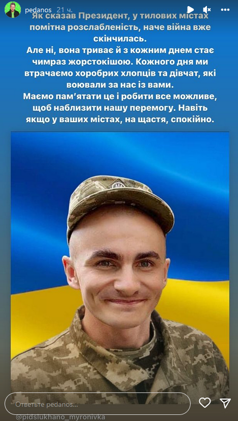 Педан також нагадав українцям, у чиїх містах не ведуться активні бойові дії, що війна триває і що щодня гинуть герої.