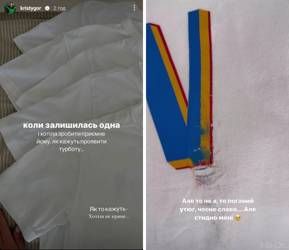 В Instagram-історіях Горняк повідомила, що залишилася вдома сама і вирішила погладити "його" футболки. Через "погану праску" вона зіпсувала одну з них: фарба від кольорового напису перейшла на білу тканину.