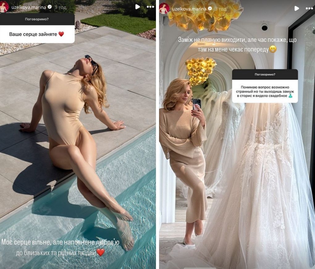 Нещодавно колишня дружина В'ячеслава Узелкова Марина Боржемська показалася в салоні весільних суконь, чим спровокувала розмови про можливе заміжжя. Спілкуючись з підписниками в Instagram, фітнес-тренерка відповіла, чи відкрила вона серце для нового кохання і чи дійсно знову виходить заміж.