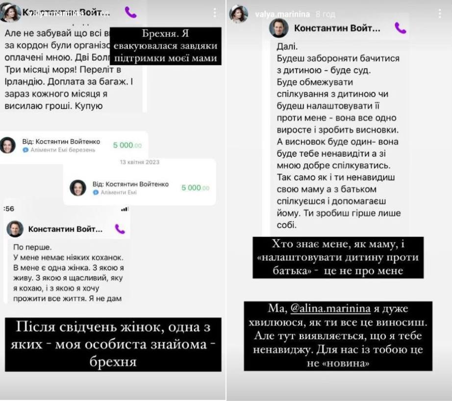 Валентина, яка з дочкою зараз живе в Ірландії, додала, що навіть переїхавши за тисячі кілометрів не може жити спокійно. Марініна стверджує, що Войтенко погрожує, маніпулює дитиною і шантажує грошима. Жінка сказала, що просто втомилася.