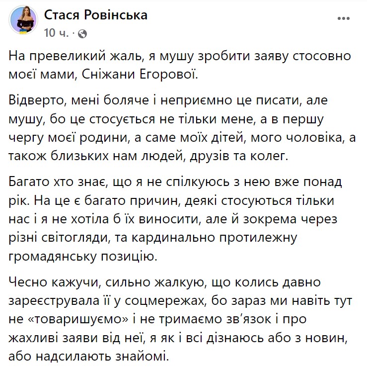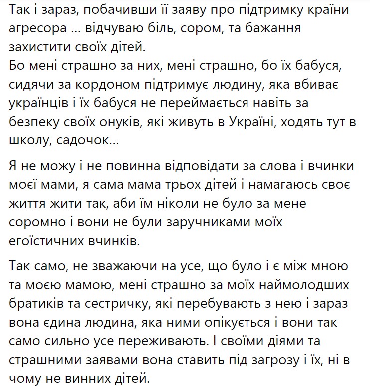 "Побачивши її [мами] заяву про підтримку країни агресора… Відчуваю біль, сором і бажання захистити своїх дітей. Тому що мені страшно за них, мені страшно, бо їхня бабуся, сидячи за кордоном, підтримує людину, яка вбиває українців. Їхня бабуся не переживає навіть за безпеку своїх онуків, які живуть в Україні, ходять тут до школи, садка… Я не можу і не маю відповідати за слова та вчинки моєї мами, я сама мама трьох дітей і намагаюся своє життя жити так, щоб їм ніколи не було за мене соромно і щоб вони не були заручниками моїх егоїстичних вчинків", - заявила старша дочка Єгорової.