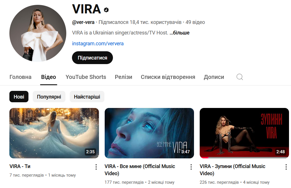 YouTube-канал з українськими піснями Брежнєвою, де вона підписана як "українська співачка"