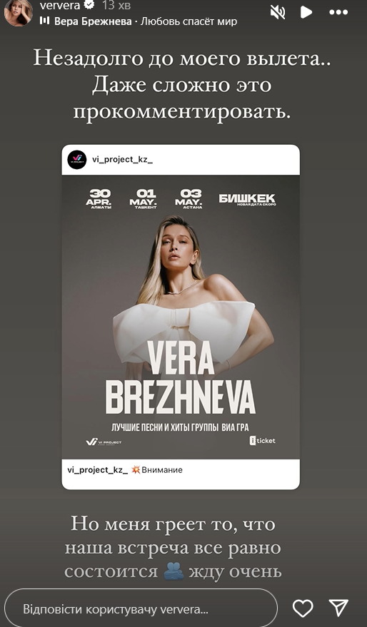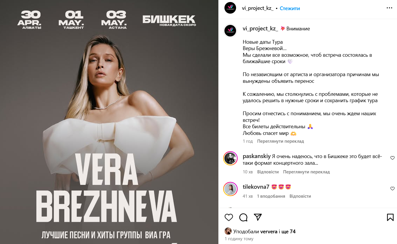 На сторінці продюсерського центру повідомили, що перенесення концертів Віри Брежнєвої в Алмати, Ташкенті, Астані та Бішкеку відбулося "через непідвладні артисту й організатору причини".