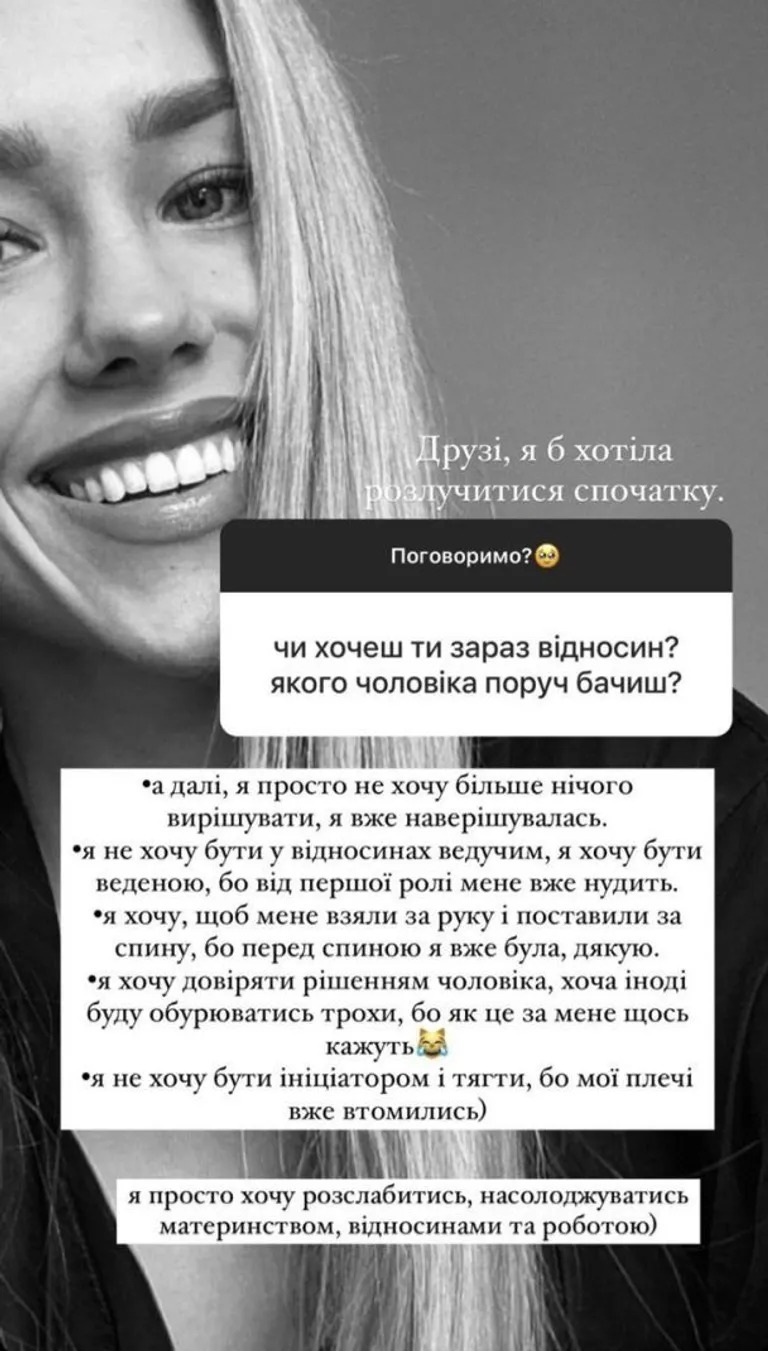 "Я просто не хочу більше нічого вирішувати, я вже навирішувалася. Я не хочу бути у відносинах ведучим, я хочу бути веденою, тому що від першої ролі мене вже нудить. Я хочу, щоб мене взяли за руку і поставили за спину, бо перед спиною я вже була, дякую. Я хочу довіряти рішенням чоловіка, хоча іноді буду обурюватися, бо як це за мене щось кажуть. Я не хочу бути ініціатором і тягти, то мої плечі вже втомилися. Я просто хочу розслабитися, насолоджуватися материнством, відносинами та роботою", - поділилася Квіткова.
