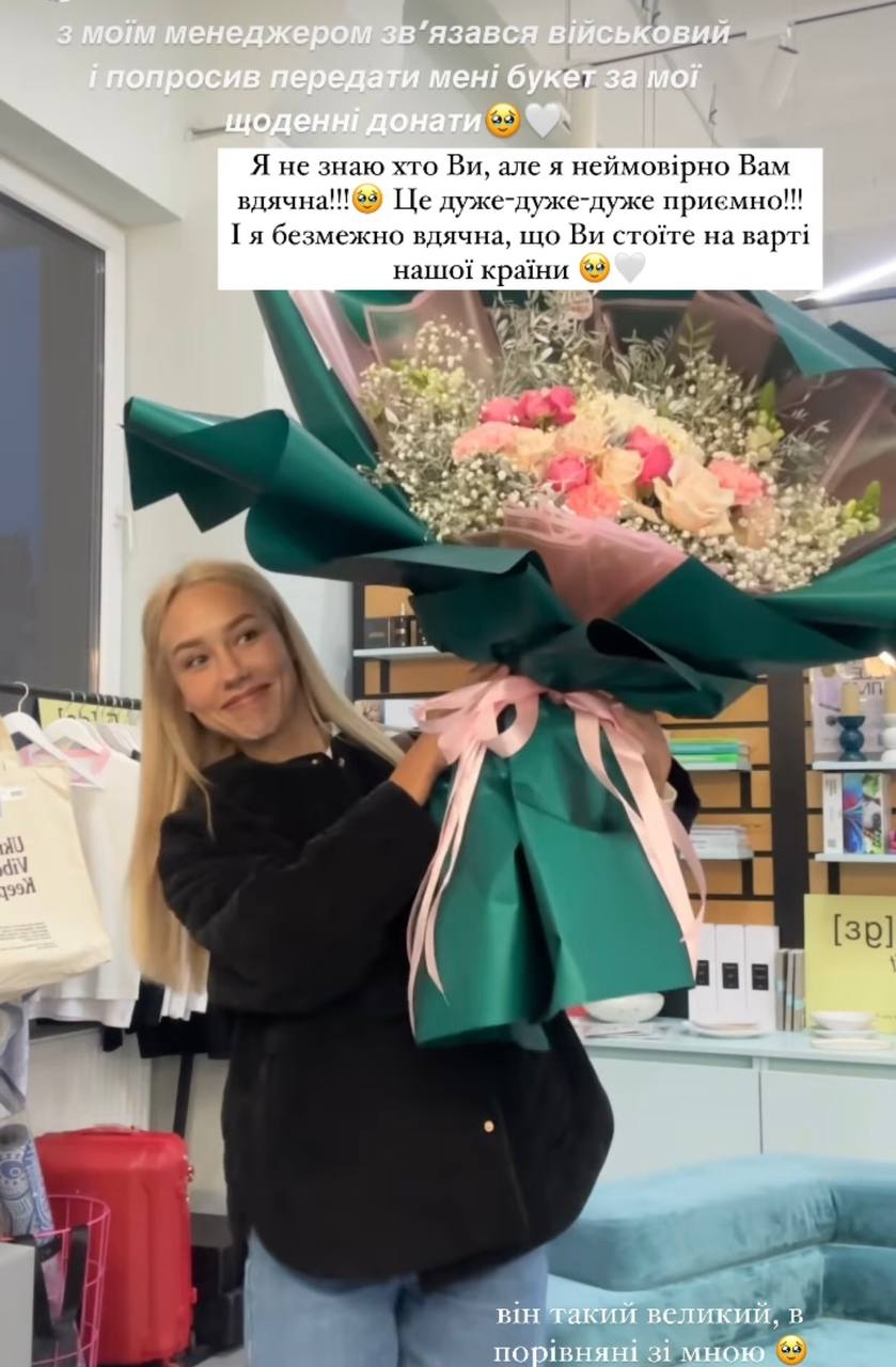 "З моїм менеджером зв'язався військовий і попросив передати мені букет за мої щоденні донати. Я не знаю хто Ви, але я неймовірно Вам вдячна! - написала щаслива Квіткова. - Це дуже-дуже приємно! І я безмежно вдячна, що Ви стоїте на варті нашої країни".