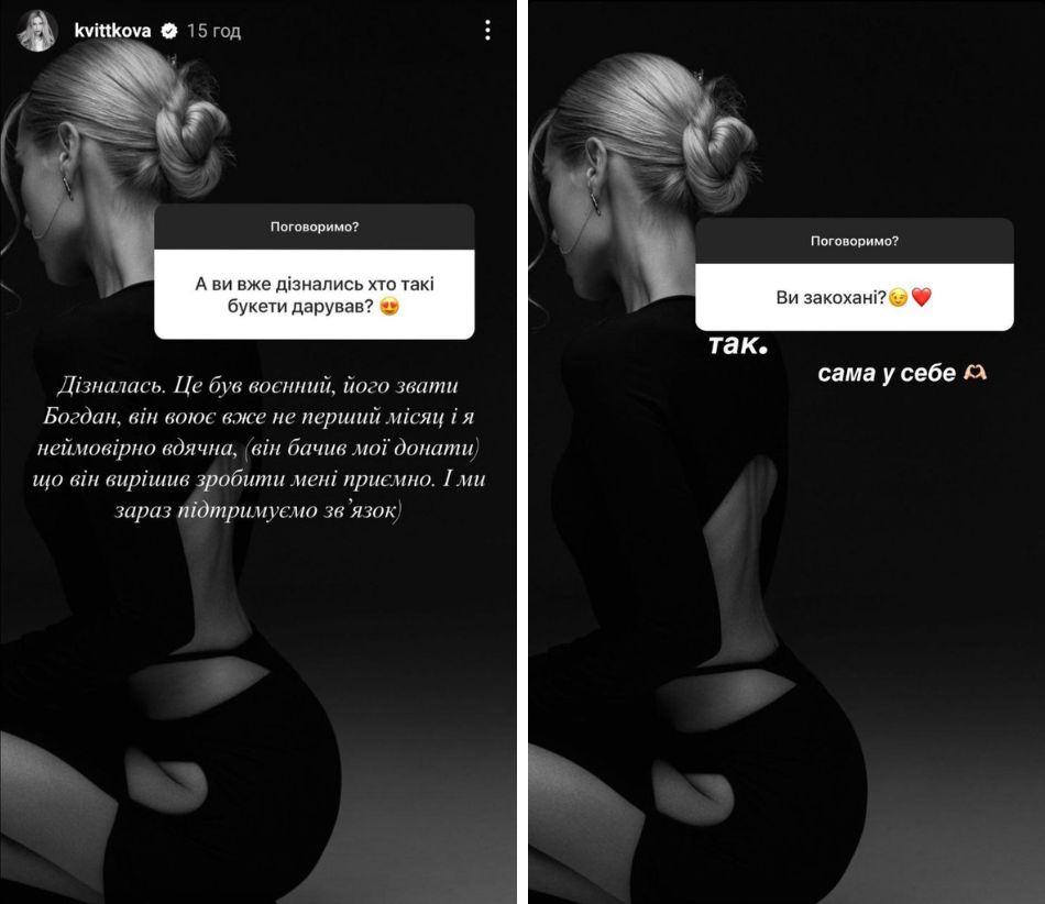 "Це був військовий, його звуть Богдан. Він воює вже не перший місяць, і я неймовірно вдячна. Він бачив мої донати і вирішив зробити мені приємно. І ми зараз підтримуємо зв'язок", - розповіла дівчина. При цьому вона зазначила, що "закохана у себе саму".