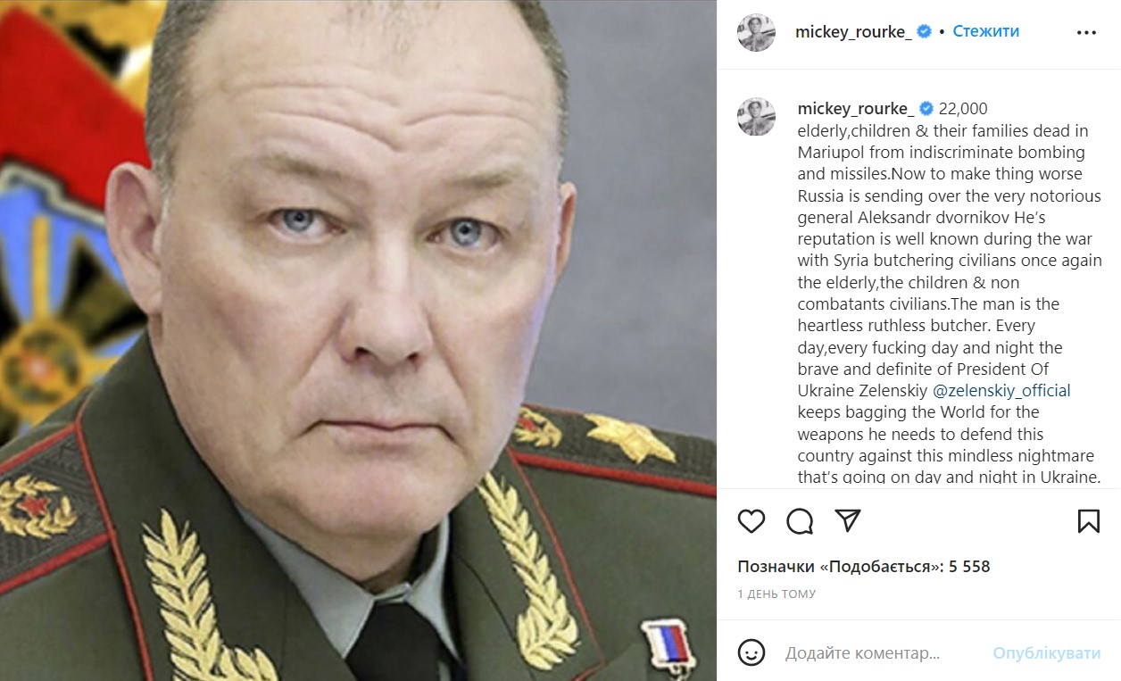 "22 тисячі людей похилого віку, дітей та членів їхніх сімей загинули в Маріуполі внаслідок бомбардувань. Тепер, що ще гірше, Росія посилає туди відомого генерала Олександра Дворнікова, репутація якого відома ще після війни з Сирією, де гинули мирні жителі. Ця людина - безсердечна, безжалісний м'ясник" - написав Міккі Рурк, прикріпивши знімок генерала, який з недавніх пір керує військами РФ у війні з Україною.