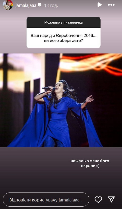 Одна з шанувальниць зірки поцікавилася про подальшу долю її переможного вбрання, на що Джамала лаконічно відповіла: "На жаль, у мене його вкрали".