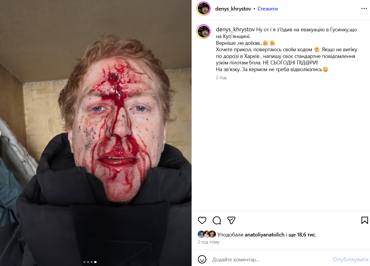 Про це він повідомив на своїй сторінці в Instagram, опублікувавши кадри розстріляної машини з написом "Евакуація цивільних", а також фото свого закривавленого обличчя: уламок влучив йому в лоб.