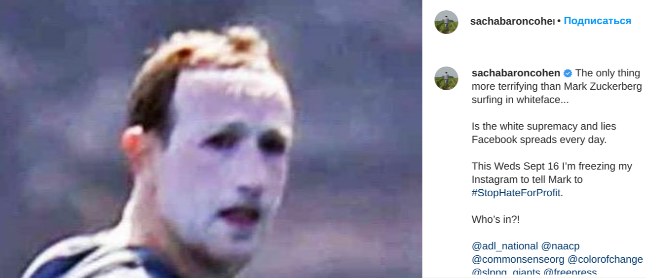 "Єдине, що лякає більше, ніж серфінг Марка Цукерберга з білим обличчям... це перевага білих і брехня, яку Facebook поширює кожен день", - заявив Саша Барон Коен.