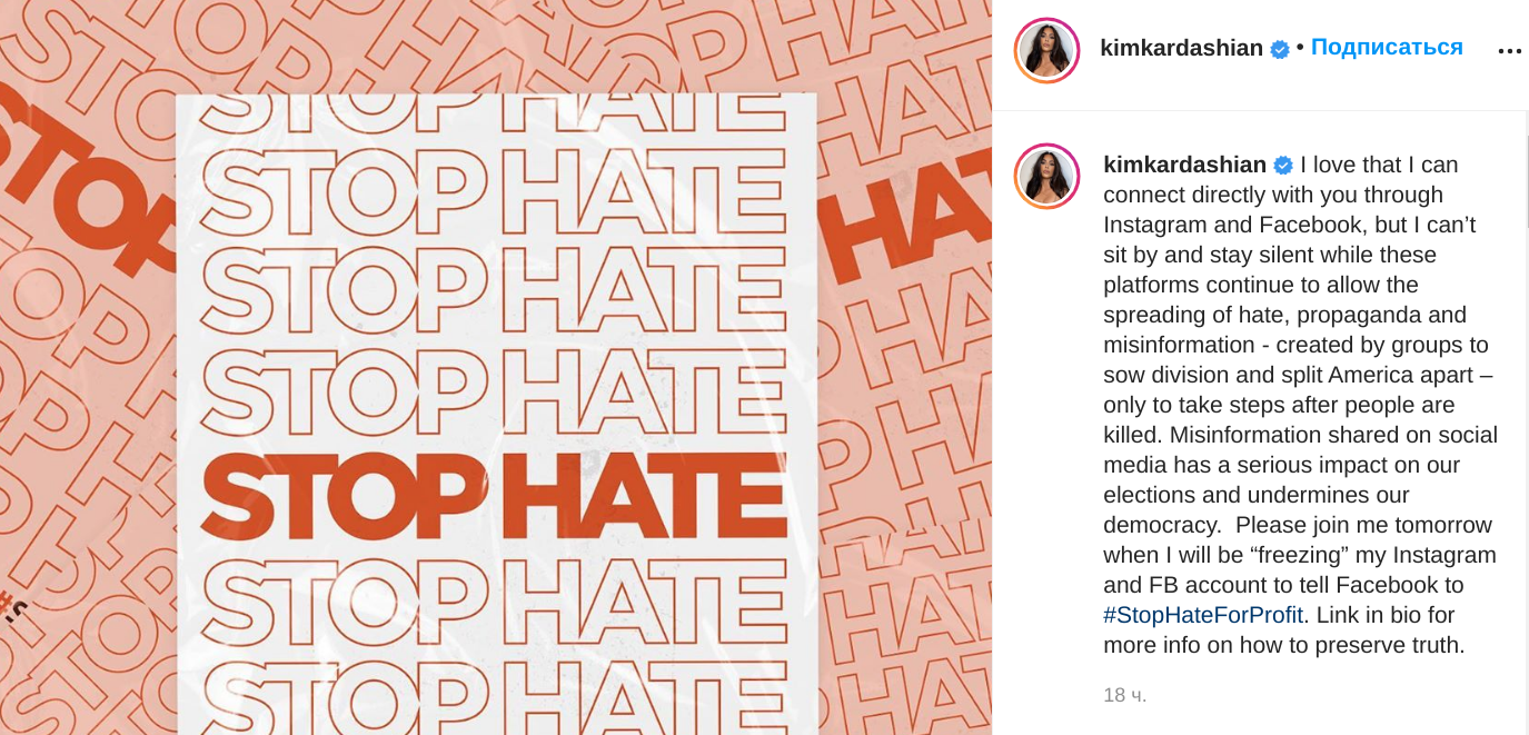 "Мені подобається, що я можу зв'язатися з вами безпосередньо через Instagram і Facebook, але я не можу сидіти склавши руки і мовчати, поки ці платформи продовжують поширювати ненависть, пропаганду і дезінформацію, - звернулася до своїх фоловерів Кардаш'ян, аудиторія якої перевищує 188 млн. чоловік. - Дезінформація, поширювана в соціальних мережах, чинить серйозний вплив на наші вибори і підриває нашу демократію. Будь ласка, приєднуйтесь до мене і заморожувати свої акаунти в Instagram і FB".