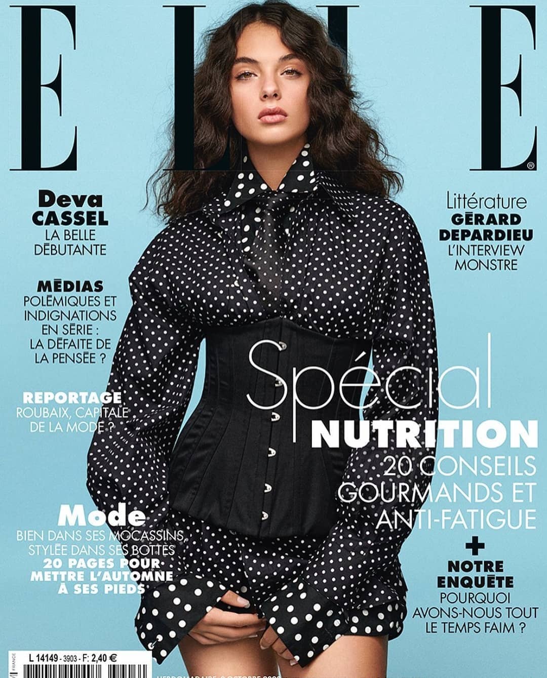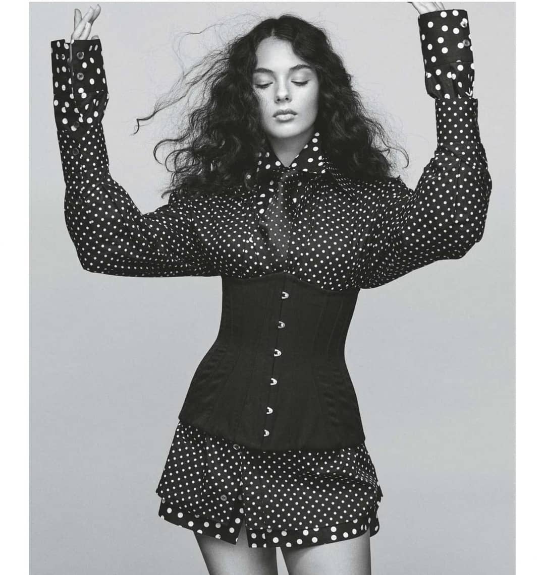 Відповідний кадр з'явився в Instagram-акаунті видання. На розміщеному знімку юна модель позує в наряді італійського будинку моди Dolce & Gabbana. На ній - багатошарова сукня в білий горох та чорний корсет.