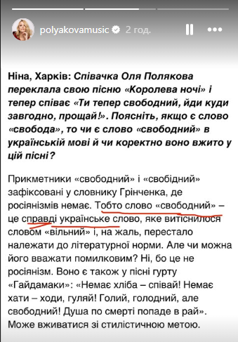 "Прикметники "свободний" і "свобідний" зафіксовані у словнику Грінченка, де росіянізмів немає. Тобто слово "свободний" -це справді українське слово, яке витіснилося словом "вільний" і, на жаль, перестало належати до літературної норми. Але чи можна його вважати помилковим? Ні, бо це не росіянізм. Воно є також у пісні гурту "Гайдамаки": "Немає хліба співай! Немає хати - ходи, гуляй! Голий, голодний, але свободний! Душа по смерті попаде в рай". Може вживатися зі стилістичною метою", - написала шанувальниця співачки.
