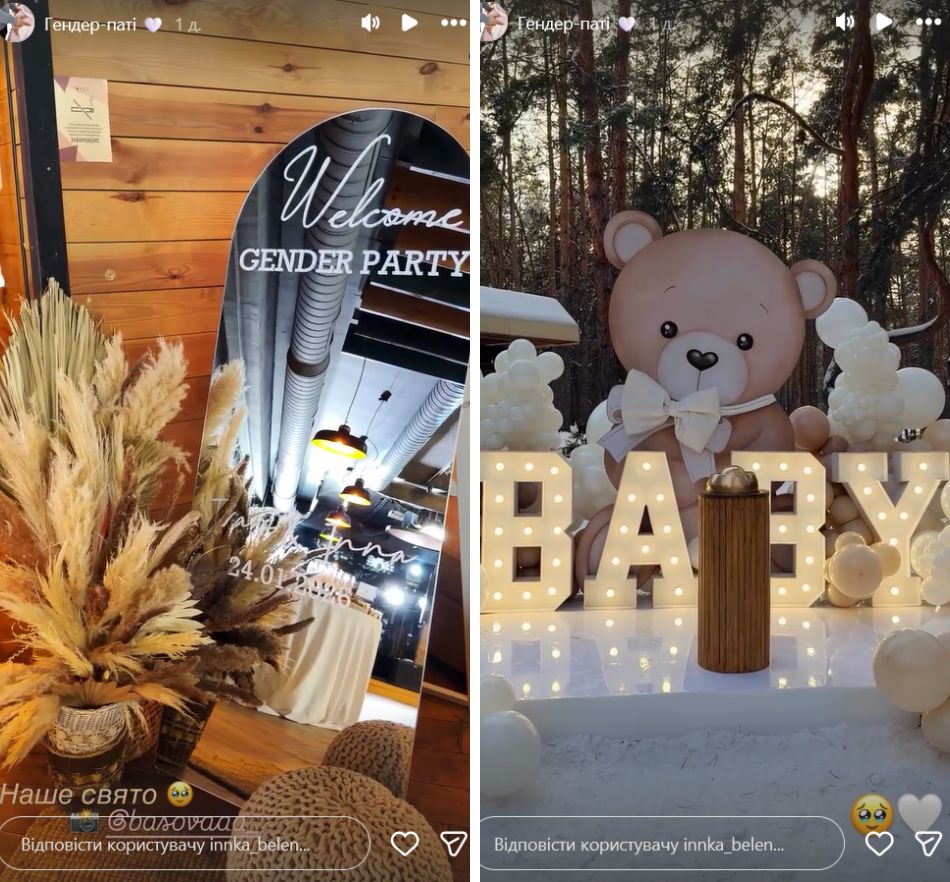 Про те, хто народиться у пари, стало відомо під час гендер-паті, яке майбутні батьки організували ще 24 січня. Протягом кількох днів Інна підігрівала цікавість своєї аудиторії, публікуючи фрагменти зі свята у стилі ведмедика Тедді.