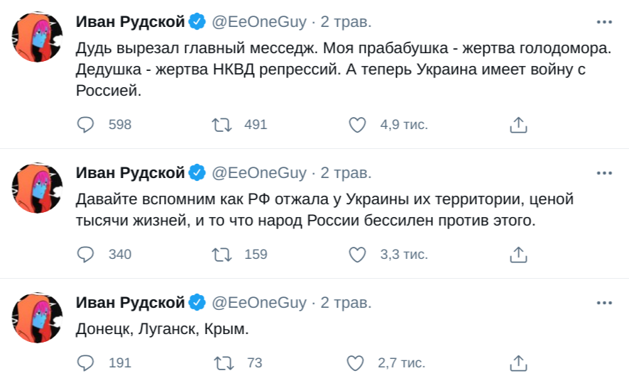 Російський журналіст Юрій Дудь відреагував на скандал, який спалахнув в мережі через звинувачення популярного блогера Івангая (Івана Рудського). У Твіттері Рудський заявив, що Дудь через боягузтво вирізав "головний меседж" його інтерв'ю: "Моя прабабуся - жертва Голодомору. Дідусь - жертва НКВД репресій. А тепер Україна має війну з Росією".