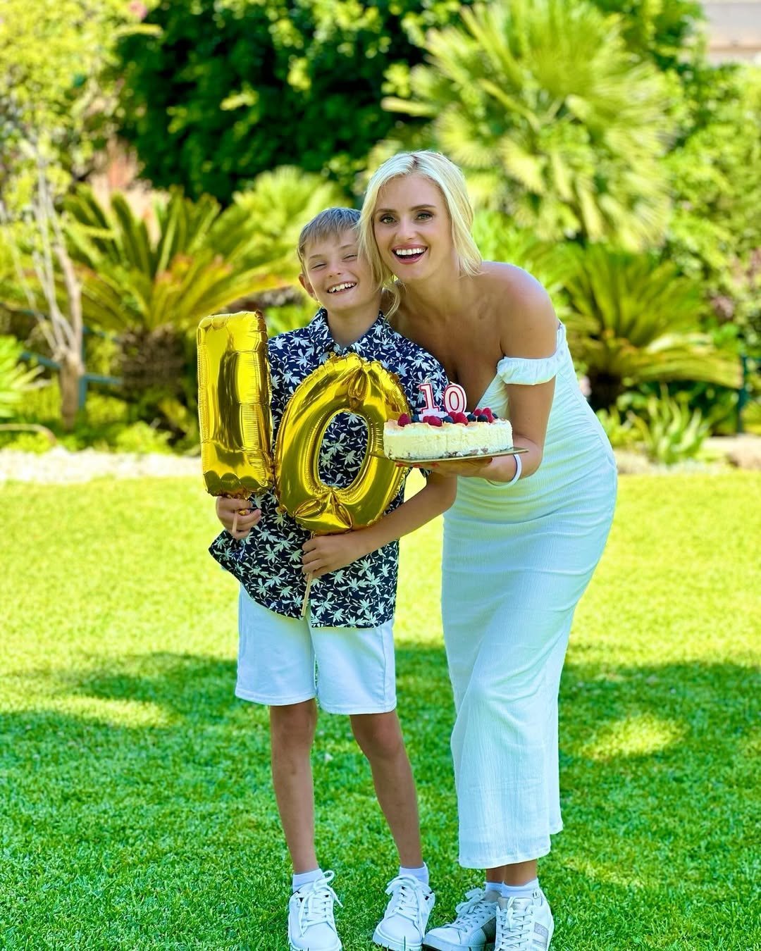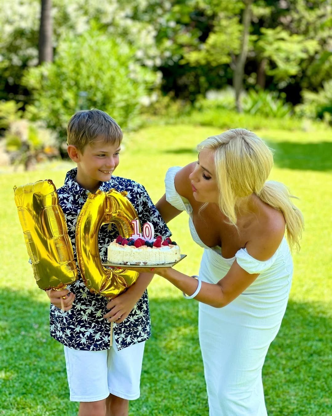 Знаменита мама розмістила серію світлин, на яких усміхнений Олег тримає кольорові кульки, а Ірина нахилилася біля нього, маючи в руках красивий торт. Ірина Федишин та її син позували на тлі розкішної зелені.