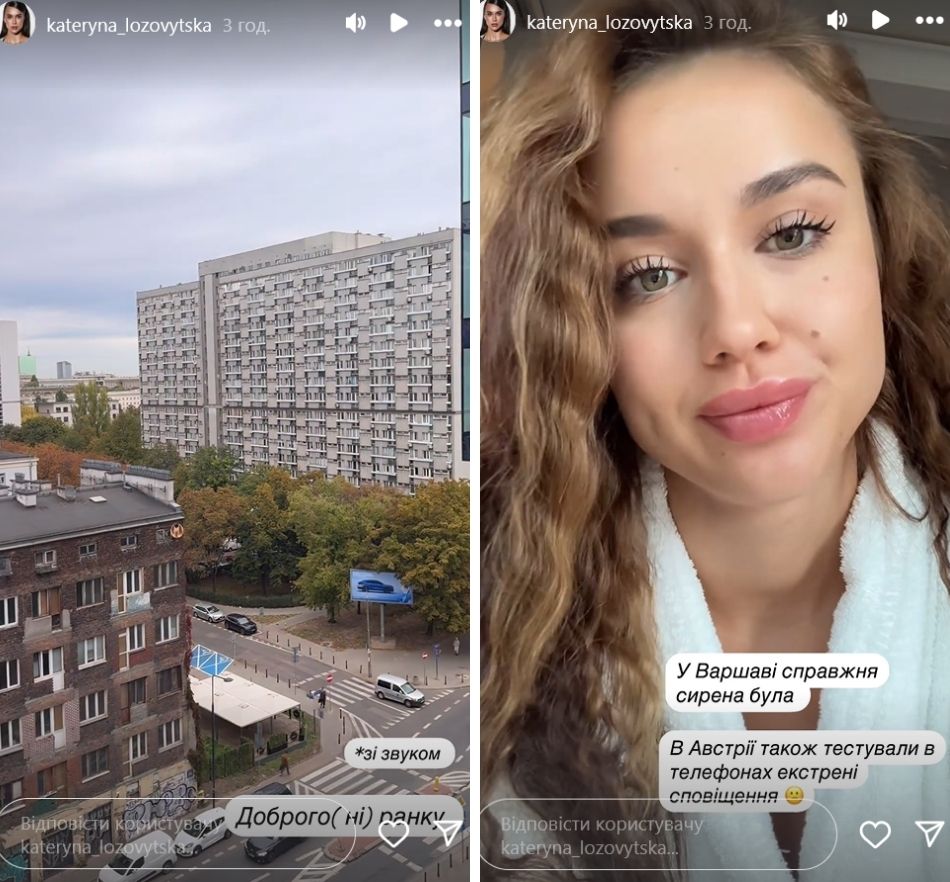 Українська фотомодель Катерина Лозовицька, яка перемогла в шоу "Холостяк-12" з Алексом Топольським, розповіла, що у деяких європейських країнах почали тестувати сповіщення про повітряну небезпеку. У період повномасштабної війни киянка живе на дві країни - Польща та Україна, тому їй добре знайомий пронизливий звук сирени.