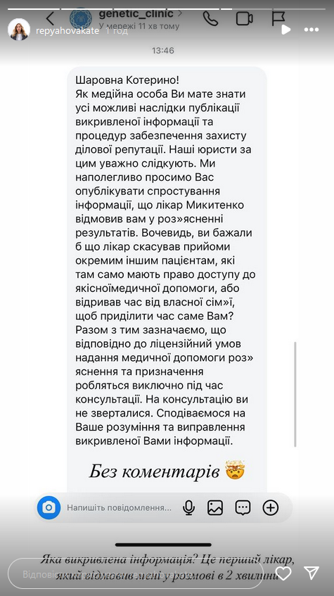 "Шановна Катерино! Як медійна особа Ви маєте знати всі можливі наслідки публікації викривленої інформації та процедур забезпечення захисту ділової репутації. Наші юристи за цим уважно слідкують. Ми наполегливо просимо Вас опублікувати спростування інформації, що лікар Микитенко відмовив вам у роз'ясненні результатів, - пишуть у клініці. - Вочевидь, Ви б хотіли, щоб лікар скасував прийоми окремим іншим пацієнтам, які також мають право доступ до якісної медичної допомоги, або відривав час від власної сім'ї, щоб приділити час саме Вам?".