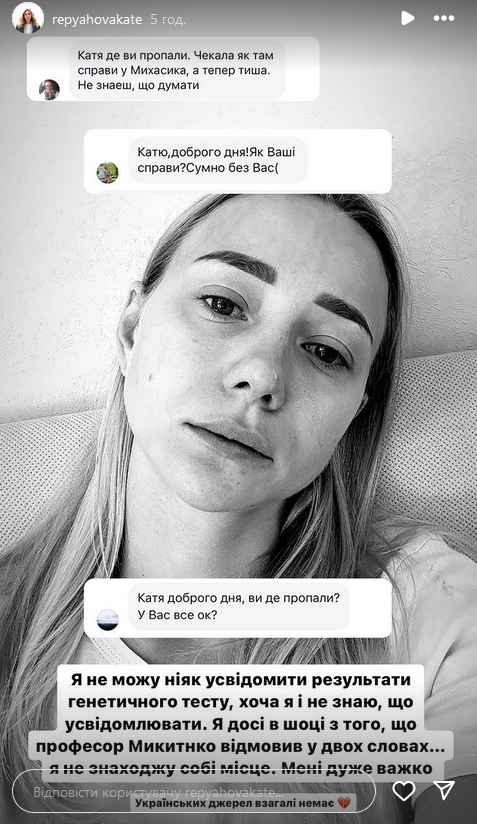 Про цю ситуацію Катерина в подробицях розповіла у себе в Instagram-блозі, на який, зважаючи на все, підписана клініка, де Репяхова робила генетичний тест синові. Співробітники центру звинуватили її у публікації "викривленої інформації" і "наполегливо" попросили опублікувати спростування. Скріншот повідомлення дружина Павліка виклала у "сторіз".