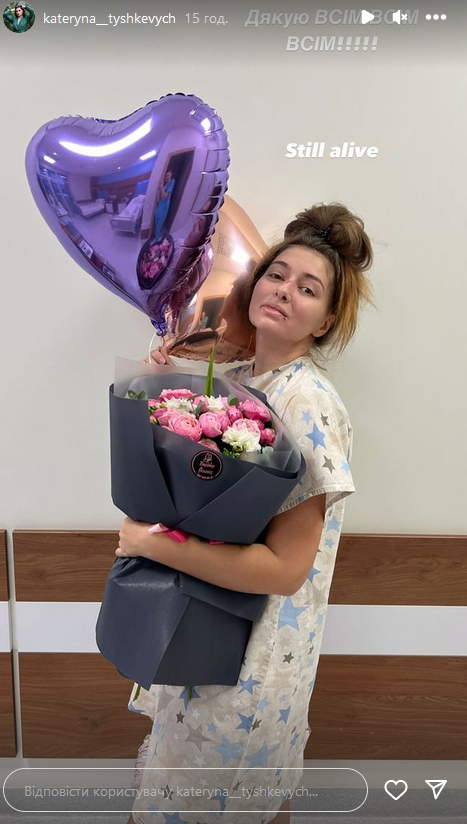 Також Катерина не забула і про своїх шанувальників та просто небайдужих українців, які підтримували її морально та фінансово у цей непростий період. "Дякую всім, всім, всім", - звернулася акторка до підписників зі своєї палати, позуючи з букетом та повітряними кульками-серцями. "Все ще жива", - додала вона.