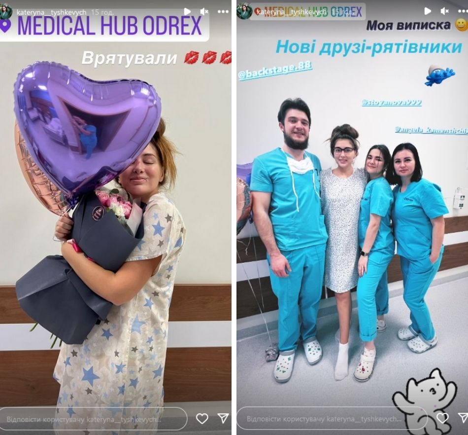 Фото з виписки щаслива дівчина опублікувала в Instagram-історіях. "Врятували", - підписала артистка світлини з медиками і назвала їх "новими друзями-рятівниками".