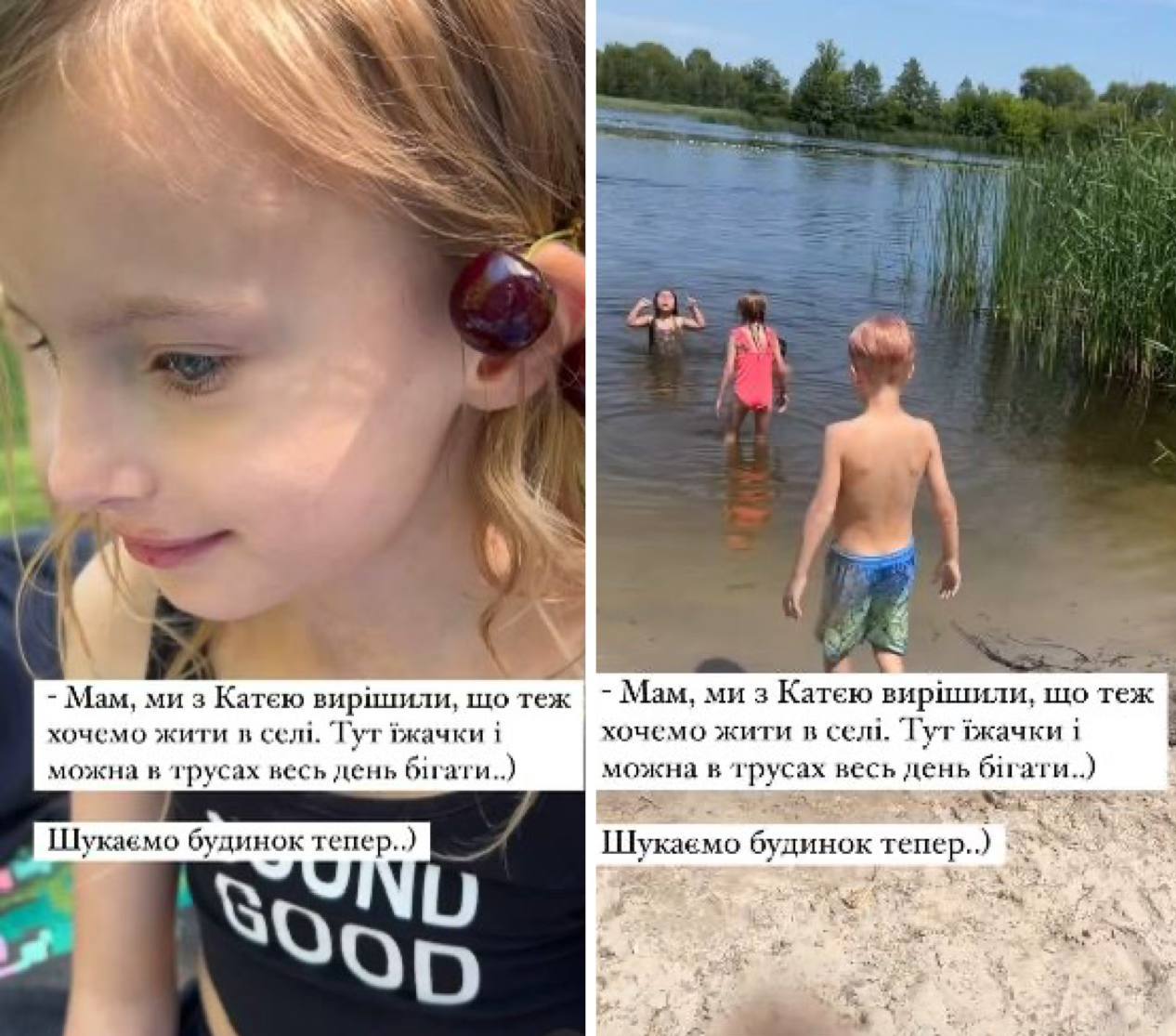 На особистій сторінці в Instagram акторка опублікувала відео з малюками, які разом з однолітками радіють літньому відпочинку на озері. А також переказала слова сина, який каже, що вони з сестрою також хочуть жити у селі. Наразі сім'я Олени Кравець шукає будинок біля води.