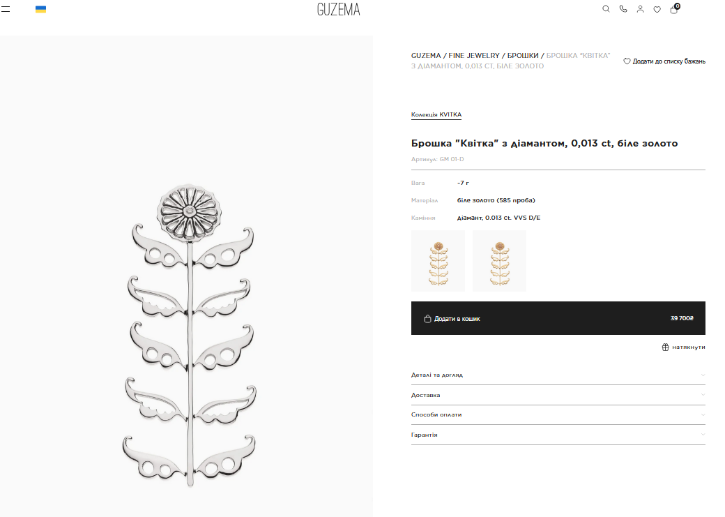 Брошка "Квітка" розроблена за мотивами творчості українського художника Георгія Нарбута, і представлена на сайті бренду у трьох варіантах. Олена Зеленська зупинила свій вибір на ювелірному виробі з білого золота з діамантом 0,013 карат. Вартість прикраси – 39 700 гривень.
