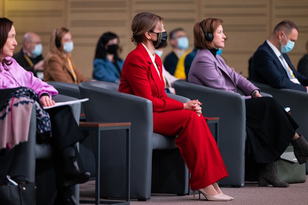 Фотографії із саміту дружина президента опублікувала на офіційній сторінці в Instagram. На знімках видно, що дружина гаранта постала перед публікою у брючному костюмі, який виконаний в червоному відтінку Poinciana - одного з найяскравіших колірних тенденцій Pantone весни 2022 року. Свій насичений аутфіт Зеленська розбавила молочною блузою та нюдовими човниками.