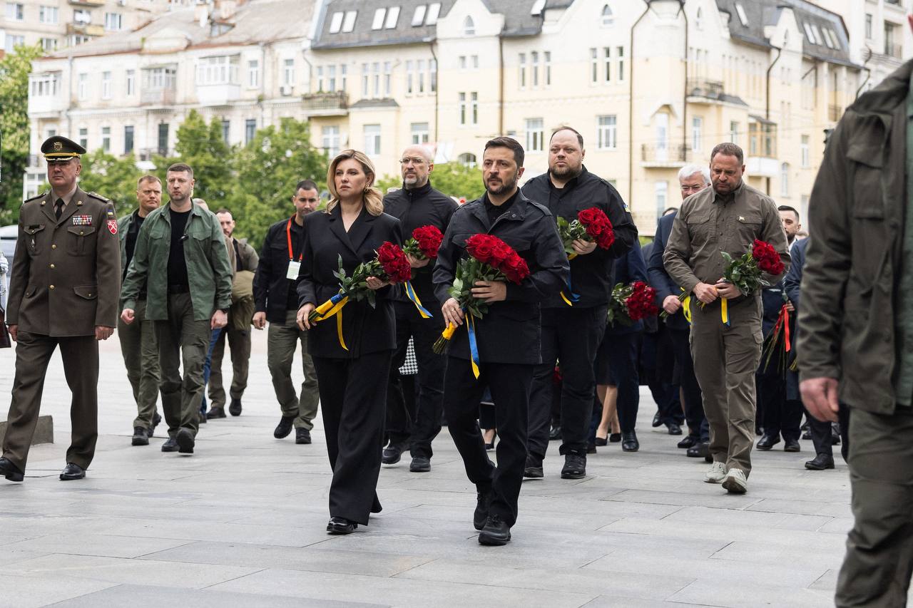 Відповідні світлини з'явилися у Telegram-каналі дружини президента. Перша леді постала у чорному костюмі, що складається з широких штанів та жакету подовженого силуету. Строгий total black доповнили туфлі-лофери. Володимир Зеленський також дотримався дрес-коду події, одягнувши одяг чорного кольору.