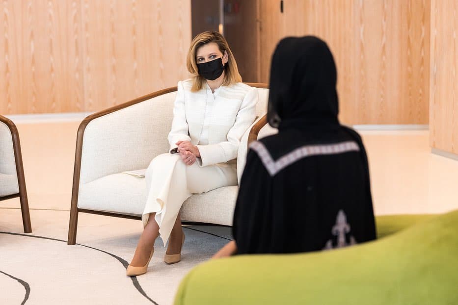 Володимир і Олена Зеленська відвідали Катар, де перша леді України зустрілася з дружиною місцевого шейха, Її Високостю шейхою Мозою бінт Насер аль-Міснед. Для цієї зустрічі дружина президента обрала строгий аутфіт молочного кольору з обтягуючою спідницею та коротким піджаком.