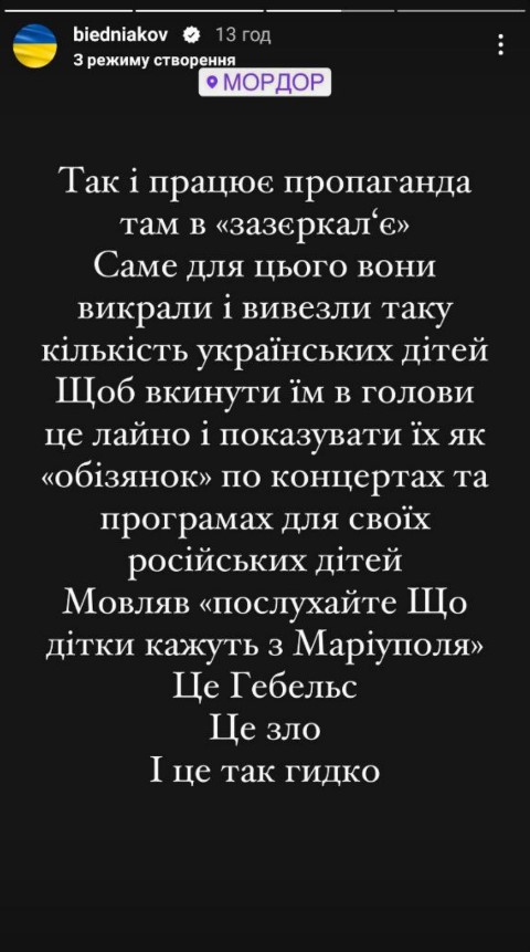 "Так і працює пропаганда там в "зазєркальє". Саме для цього вони викрали і вивезли таку кількість українських дітей. Щоб вкинути їм в голови л*йно і показувати їх як "обізянок" на концертах та програмах для своїх російських дітей. Мовляв, "послухайте, що дітки кажуть з Маріуполя". Це Геббельс. Це зло. І це так гидко", - також зазначив Бєдняков.