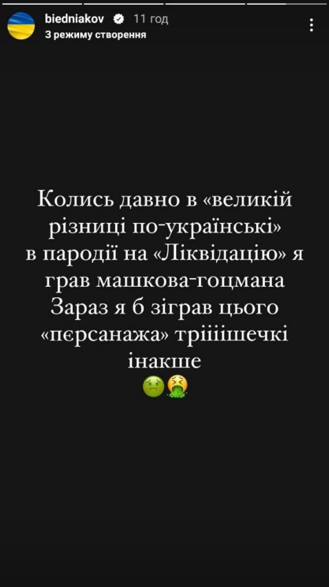 "Колись давно у "Великій різниці по-українськи" в пародії на "Ліквідацію" я грав Машкова-Гоцмана. Зараз би я зіграв цього персонажа трішечки інакше", - йдеться в публікації ведучого.