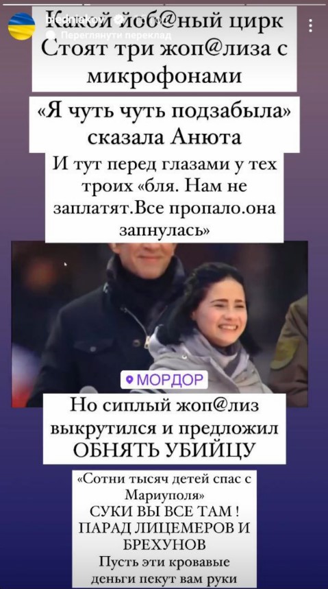 "Який й*баний цирк. Стоять три ж*полизи з мікрофонами. "Я трохи забула" – сказала Ганнуся, і тут перед очима у тих трьох "бл*, нам не заплатять, все пропало, вона запнулася". Однак сиплий ж*полиз викрутився і запропонував обійняти вбивцю. "Сотні тисяч дітей врятував з Маріуполя"… С*ки ви всі там. Парад лицемірів, брехунів. Нехай ці криваві гроші обпечуть вам руки", - висловився шоумен.