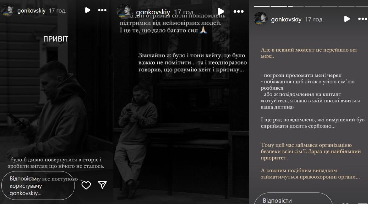 "За ці дні отримав сотні повідомлень підтримки від неймовірних людей. І це те, що дало багато сил. Звичайно ж, були і тонни хейту, це було важко не помітити... Та я неодноразово говорив, що розумію хейт і критику", - написав Гонковський.