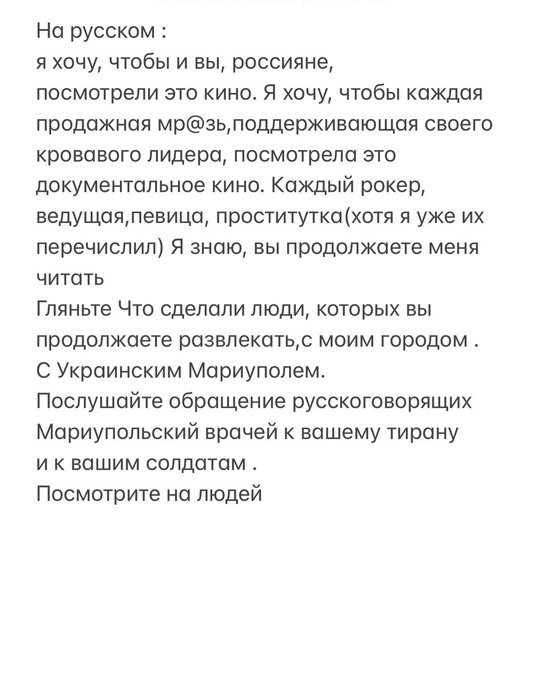 "Я знаю, ви продовжуєте мене читати. Дивіться, що зробили люди, яких ви продовжуєте розважати, з моїм містом. З українським Маріуполем. Послухайте звернення російськомовних маріупольських лікарів до вашого тирана та до ваших солдатів. Подивіться на людей", - звернувся ведучий "Орла і Решки" до мешканців країни-терористки.