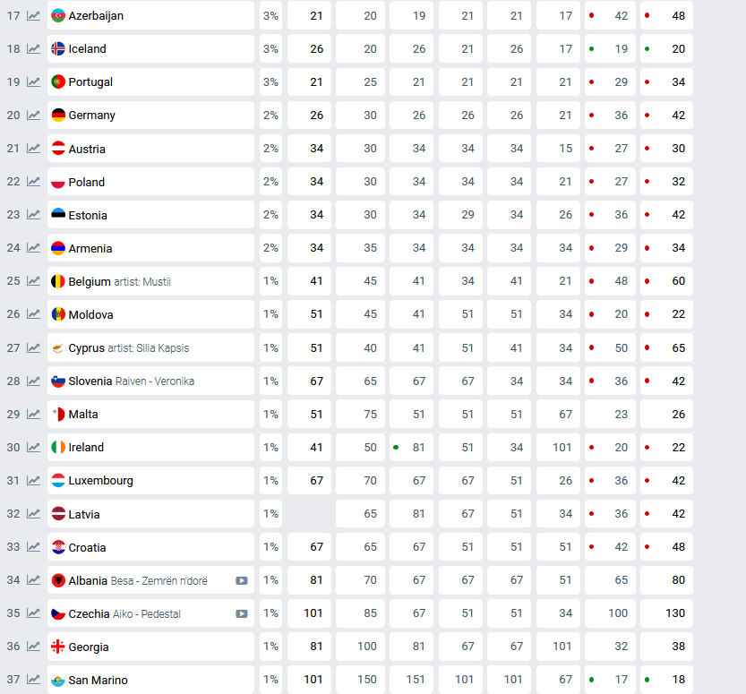 Друге місце у рейтингу посідає Ізраїль. Країна, як і більшість учасників "Євробачення-2024", з представником ще не визначилася.