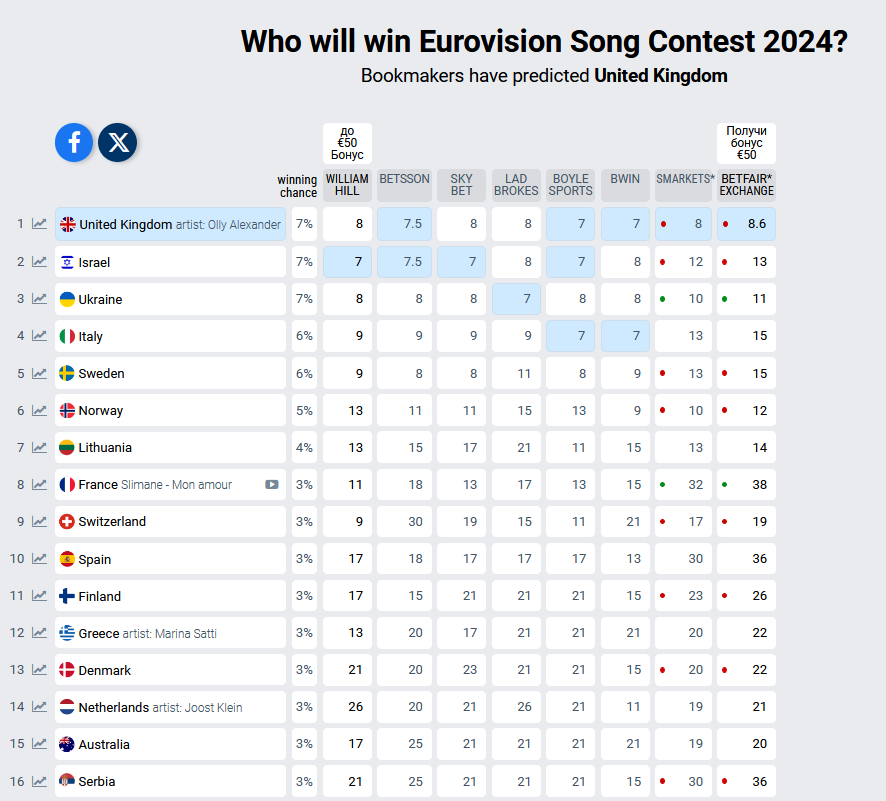 Третє місце букмекери віддали Україні. Представника нашої країни оберуть 3 лютого 2024 року. Фінал Нацвідбору на "Євробачення-2024" пройде у форматі телевізійного концерту, переможця визначать голосуванням журі та глядачів. Серед фіналістів: дует alyona alyona та Jerry Heil, Drevo, INGRET, MÉLOVIN, NAHABA, NAZVA, SKYLERR, YAGODY, YAKTAK, Ziferblat та ANKA.