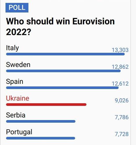 Так, можна побачити, що на першому місці опинилася Італія, за яку фанати віддали більше 13 тисяч голосів. На другому – Швеція із кількістю голосів 12 874. На третьому – Іспанія, яка набрала трішки менше голосів, ніж Швеція. На четвертому – Україна. У перемогу нашої країни вірять трішки більше 9000 користувачів, які вже встигли проголосувати.